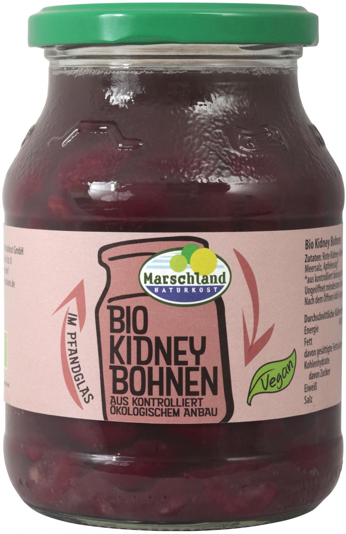 Tafelfertig zubereitete biologische Kidney-Bohnen, die durch Zusatz eines süßsauren Aufgusses und durch Sterilisation, im luftdicht verschlossenen Behältnis, Pfandglas, dauerhaft haltbar gemacht worden sind.