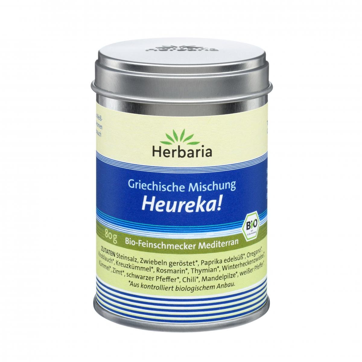Herbaria Heureka ist eine griechische Bio-Gewürzmischung für Gyros, Hackfleisch, gegrilltes und gebratenes Fleisch und Gemüse. Auch für vegane Gerichte aus Fleischalternativen wie beispielsweise Tofu oder Soja-Schnetzel ist diese Gewürzmischung perfekt geeignet. Mit Zutaten wie gerösteten Zwiebeln, Paprika, Knoblauch, Kreuzkümmel, Rosmarin und Thymian schmeckt diese Gewürzmischung würzig nach mediterranen Kräutern und erinnert bereits beim Öffnen der Dose an die griechische Küche. Die Bio-Gewürzmischung kann als Trockenmarinade und auch zusammen mit Öl vor oder während der Zubereitung verwendet werden.