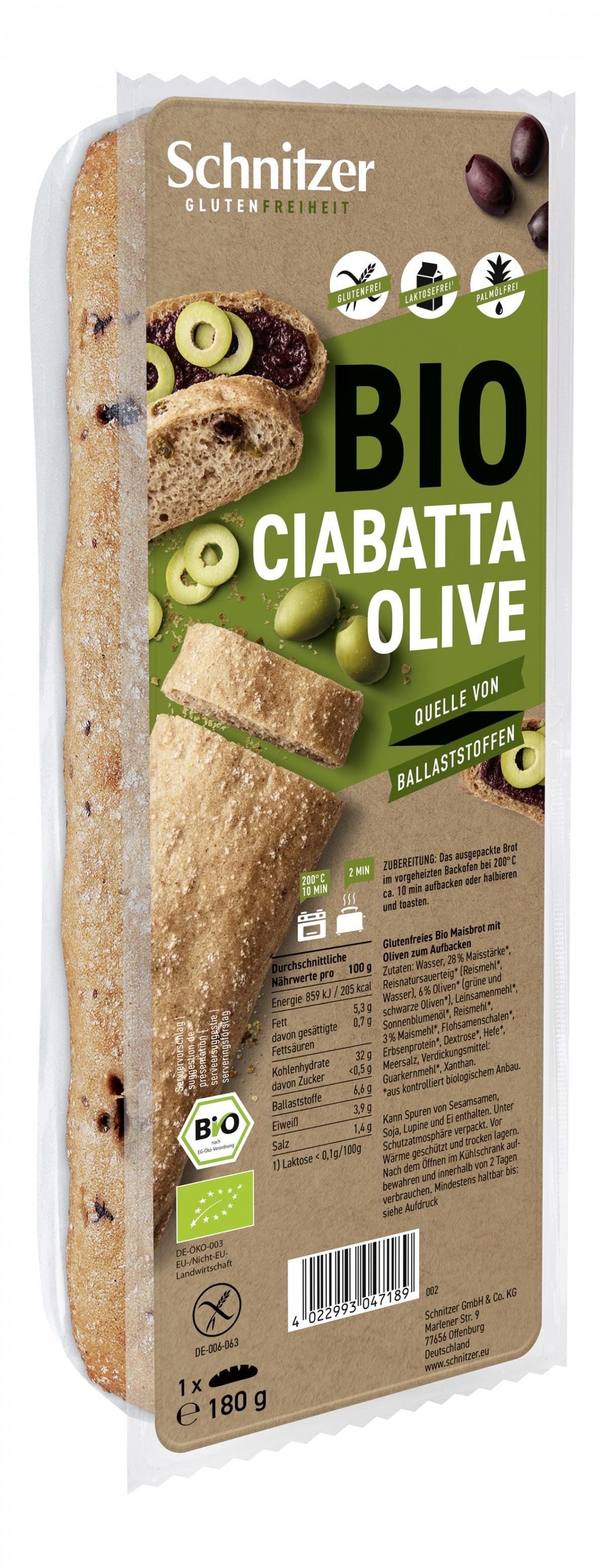 Wasser, 28 % Maisstärke*, Reisnatursauerteig* (Reismehl*, Wasser), 6 % Oliven* (schwarze und grüne Oliven*), Leinsamenmehl*, Sonnenblumenöl*, Reismehl*, 3 % Maismehl*, Flohsamenschalen*, Erbsenprotein, Dextrose*, Hefe*, Meersalz, Verdickungsmittel: Guarkernmehl*, Xanthan
