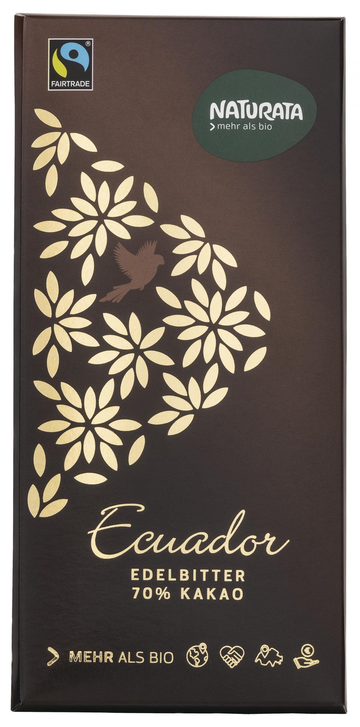Edle Bio-Schokolade, beste Qualität: Der erlesene Arriba-Edelkakao stammt aus der Region Vinces in Ecuador. Für diese zartschmelzende Schokolade wird er dort von ausgewählten Bauern nach strengen Bio-Richtlinien angebaut und schonend weiterverarbeitet. Mit seinem besonders kräftigen Geschmack verleiht der Kakao dieser Edelbitter-Schokolade ein charakteristisches, volles Aroma. Das Geheimnis des feinen Schmelzes und des einzigartigen Geschmacks liegt im besonderen Herstellungsverfahren: In traditioneller Schweizer Handwerkskunst lassen die Chocolatiers durch besonders langes Conchieren feine Schokolade entstehen, die auf der Zunge zergeht. Wie bei allen Naturata Schokoladen enthält die natürliche Rezeptur nur fair gehandelte Zutaten aus 100 % kontrolliert biologischem Anbau. Ohne künstliche Aromen oder Emulgatoren!