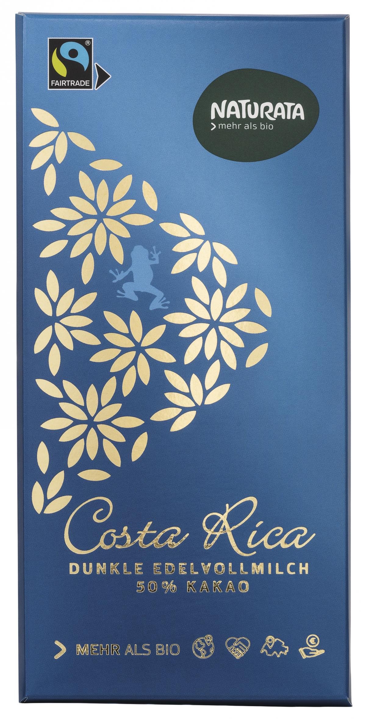 Eine Schokolade edler Herkunft: Der erlesene Trinitario-Edelkakao wächst süd-östlich von Costa Ricas Hauptstadt San José. Die Kakaobohnen werden dort nach strengen Bio-Richtlinien von Kleinbauernfamilien angebaut und auf schonende Weise weiterverarbeitet. Die Komposition aus feinster Schweizer Vollmilch und dem hohen Edelkakao-Anteil verleiht dieser dunklen Vollmilch-Schokolade ein kräftiges, volles Aroma.