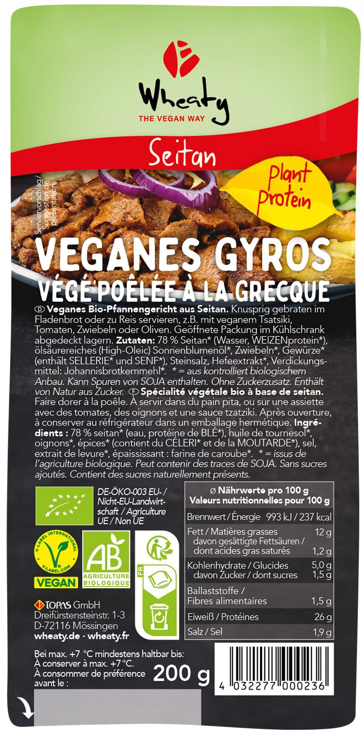 78 % Seitan* (Wasser, WEIZENeiweiß*), ölsäurereiches (High-Oleic) Sonnenblumenöl*, Zwiebeln*, Gewürze* (enthält SELLERIE* und SENF*), Steinsalz, Hefeextrakt*, Verdickungsmittel: Johannisbrotkernmehl*.