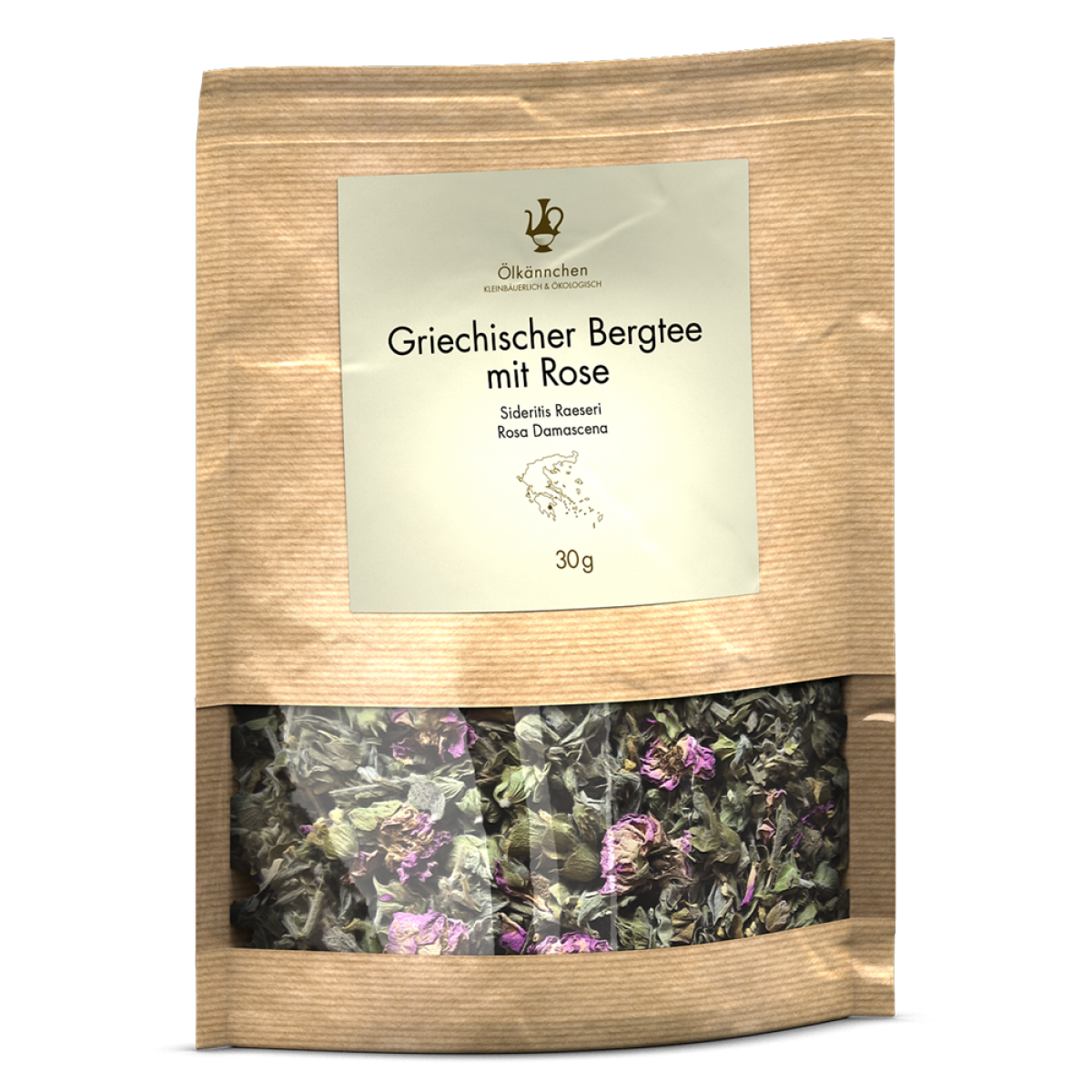 Der griechische Bergtee der Sorte Sideritis Raeseri ist auf dem Peloponnes in Höhenlagen endemisch. Bio Parnon, bestehend aus den drei Partnern Takis, Georgios und Ilias, baut diesen auf ca. 1000 m Höhe in weitreichend unberührter Natur an. Die Ernte erfolgt von Hand und die Trocknung natürlich in Bündeln ohne maschinelle Wärmezufuhr. Der Tee ist daher besonders aromatisch. Die Damaszener Rose verleiht dem griechischen Bergtee ein zart duftendes Rosenaroma. Die Teemischung mit kochendem Wasser aufgießen und ein paar Minuten ziehen lassen. Auch ein zweiter Aufguss ist möglich.