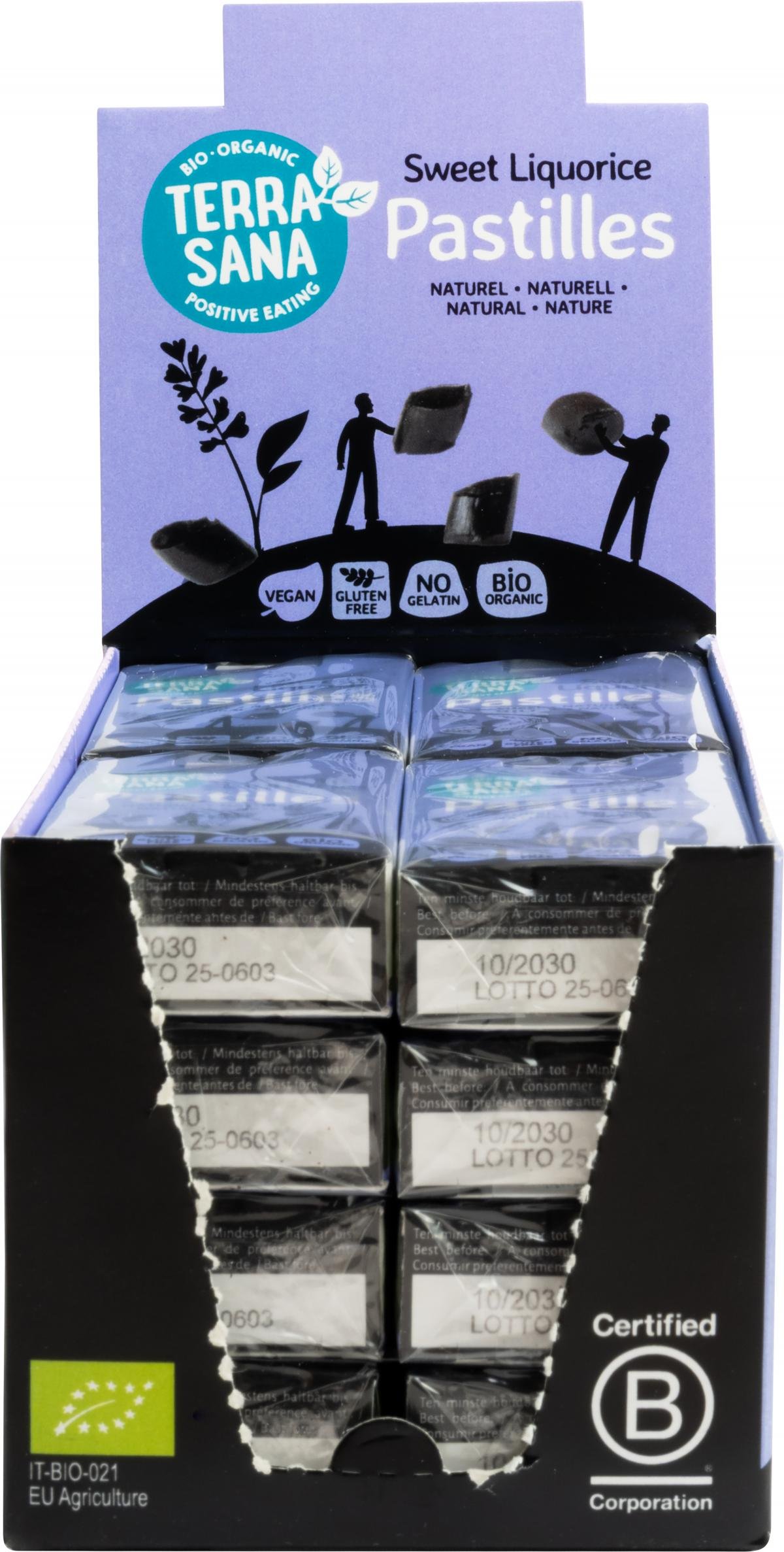 Diese kleinen, biologischen Lakritzpastillen sind fantastisch für den nötigen kleinen Energieschub. Sie werden in einer praktischen kleinen Schachtel angeboten, die du ganz einfach immer in der Tasche haben kannst. Herrlich rein und mit charakteristischem Geschmack. Sie werden aus reinem Süßholzwurzelextrakt aus Süditalien hergestellt. Sonst nichts. Sie sind daher auch 100 % vegan und enthalten nur halb so viele Kalorien wie die meisten Lakritzsorten. So kannst du zu jeder Tageszeit den einzigartigen Lakritzgeschmack genießen! Probiere die Pastillen auch einmal in den Geschmacksrichtungen Anis und Minze.