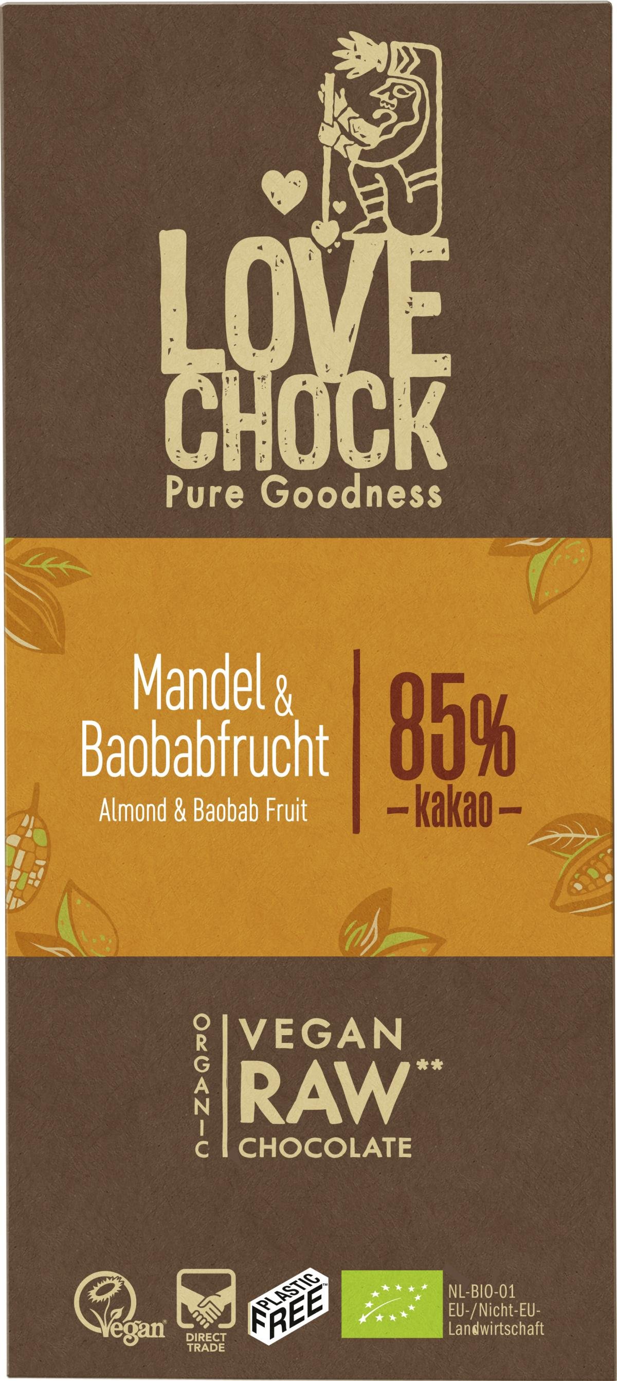 "Raffinierter Mix aus knusprigen Mandeln und spritzig-frischer Frucht in veganer, dunkler Rohschokolade. Baobab ist auch als Affenbrotbaumfrucht bekannt.