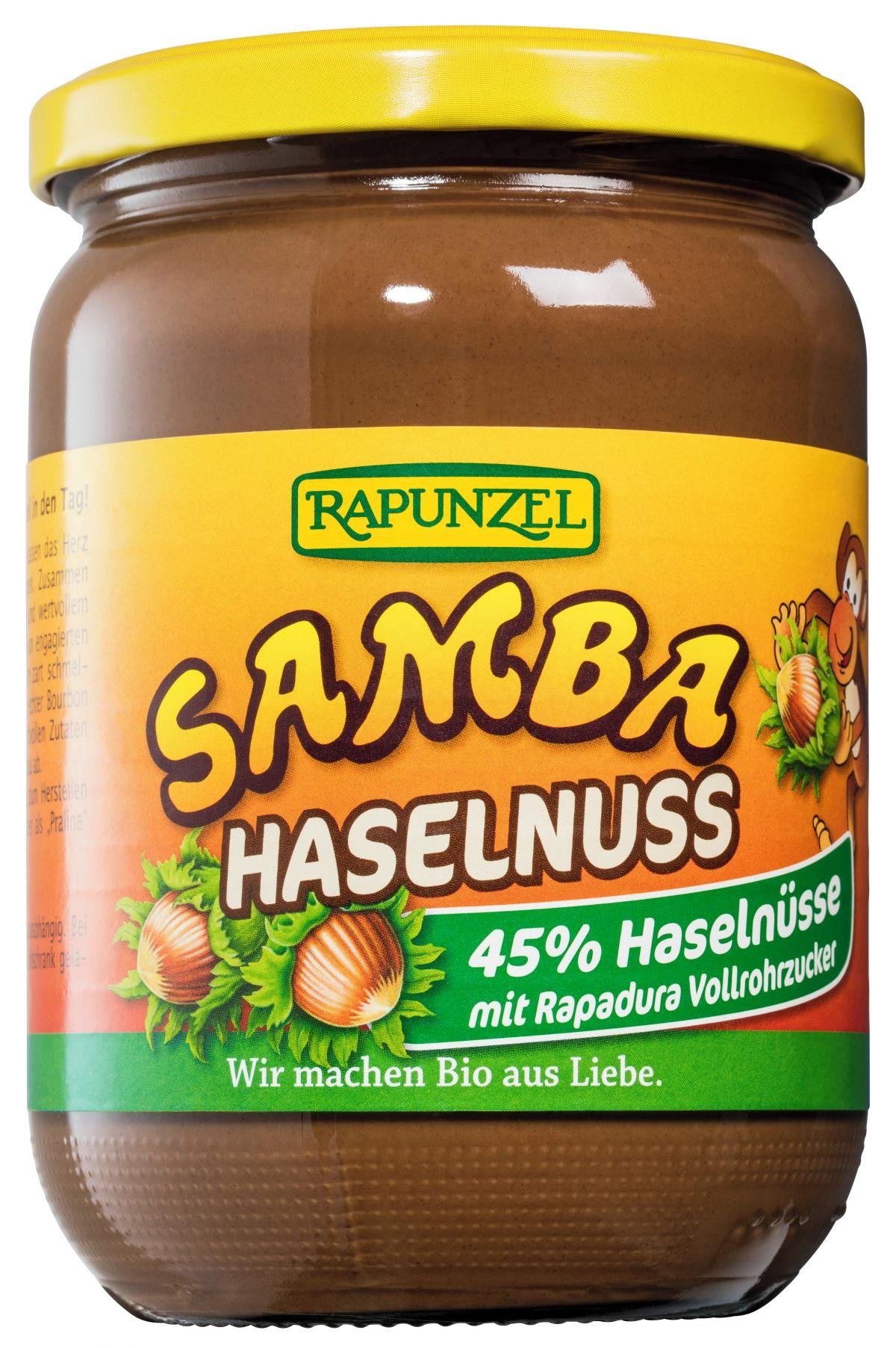 Starten Sie mit Samba schwungvoll in den Tag! 45 % aromatisch geröstete Haselnüsse lassen das Herz eines jeden Nuss-Fans höher schlagen. Zusammen mit edlem Kakao, Allgäuer Vollmilch und wertvollem Rapadura Vollrohrzucker werden sie zum zart schmelzenden Samba verarbeitet. Ein Hauch echter Bourbon Vanille rundet den Geschmack der wertvollen Zutaten ab. Rapadura Vollrohrzucker, Cristallino Rohrzucker, Palmöl und Kakaopulver sind fair gehandelt und stammen von unseren HAND IN HAND-Partnern. Die Konsistenz ist temperaturabhängig. Bei Zimmertemperatur cremig, im Kühlschrank gelagert fest.